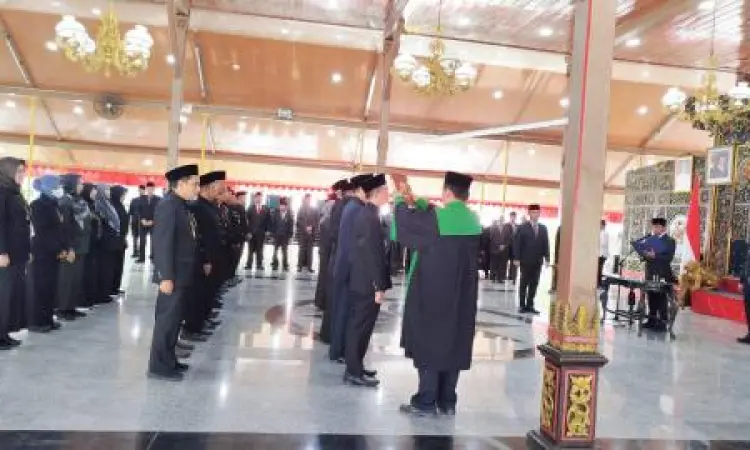 BANGKALAN - Menjelang pergantian tahun 2025 ke 2026, Bupati Bangkalan, Lukman Hakim, kembali melakukan mutasi dan promosi jabatan terhadap 29 pejabat di lingkungan Pemerintah Kabupaten Bangkalan. Pelantikan dan pengambilan sumpah jabatan struktural pimpinan tinggi Pratama dan Administrator berlangsung di pendopo agung Bangkalan, Rabu (31/12/2025).