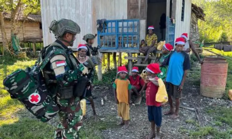 YAHUKIMO, KANALINDONESIA.COM: Satgas Pamtas RI–PNG Yonif 5 Marinir membagikan bingkisan Natal kepada warga di Kabupaten Yahukimo, Papua Pegunungan, Minggu (28/12/2025). Aksi sosial ini untuk mewujudkan suasana Natal yang damai dan penuh sukacita di wilayah perbatasan.